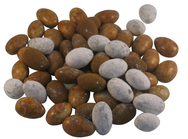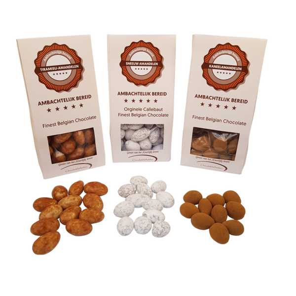 AMANDELEN 25%: AMANDELEN 24,75%, arachideolie 0,25%, Chocolade MELK 49,50%, suiker 26,48%, cacaoboter 7,67%, volle MELKpoeder 7,67%, cacaomassa 7,43%, SOJAlecithine 0,12%, natuurlijke vanille aroma 0,12%, Chocolade yoghurt 24,90% : suiker 13,05%, cacaoboter 6,47%, volle MELKpoeder 3,49%, MELKsuiker 1,25%, magere MELKpoeder 0,5%, SOJAlecithine 0,06%, YOGHURTpoeder 0,02%, Tiramisu aroma 0,80%, Arabische gom 0,08%, Shellak 0,02%